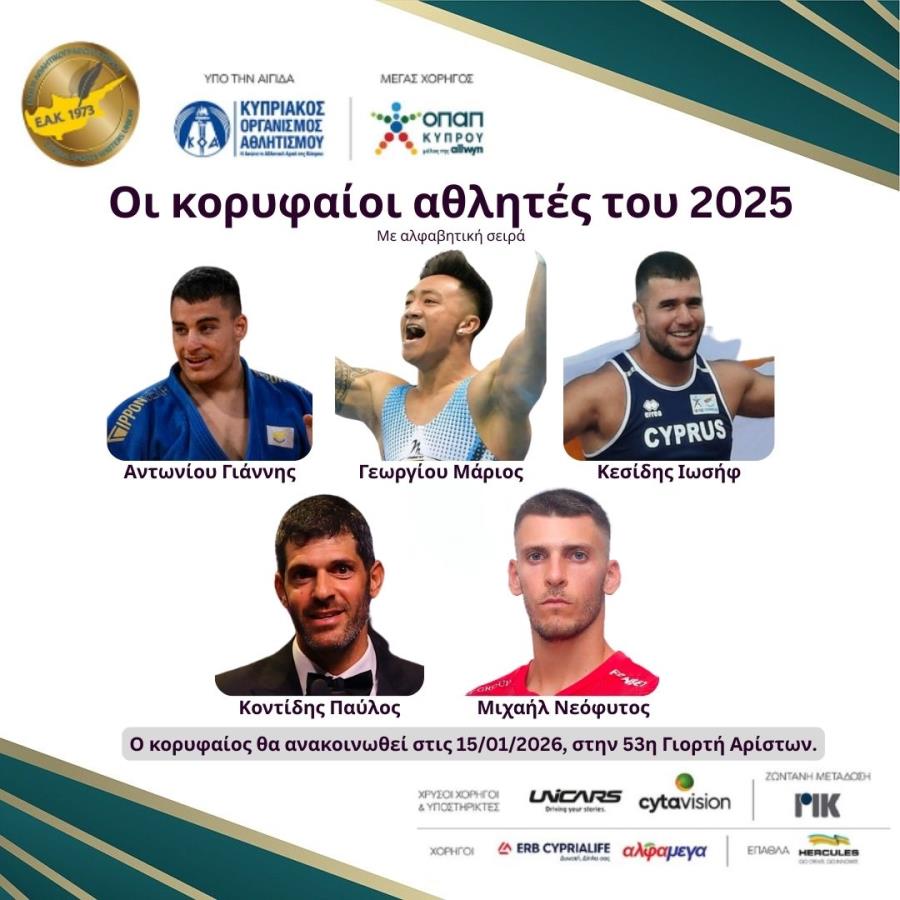 - Κεσίδης Ιωσήφ (στίβος): Οι συνεχόμενες επιτυχίες για τον 20χρονο (19/08/2005) σφυροβόλο τον φέρνουν για τρίτη σερί φορά στους κορυφαίους. Στις δύο πιο σπουδαίες του διακρίσεις το 2025, κατέκτησε το χρυσό μετάλλιο στη σφυροβολία στο Πανευρωπαϊκό Πρωτάθλημα Κ23 και ένα ακόμα χρυσό στο Ευρωπαϊκό Κύπελλο Ρίψεων Κ23 που έγινε στη Λευκωσία. Ακόμα, κατετάγη 7ος στην Παγκόσμια Πανεπιστημιάδα της Γερμανίας και 6ος στο Βαλκανικό Πρωτάθλημα.