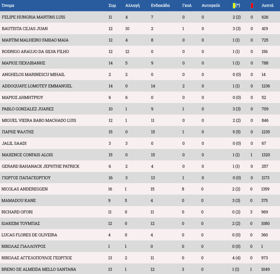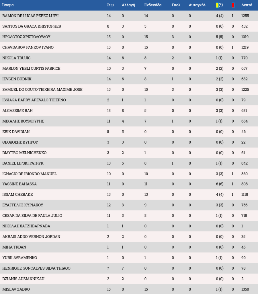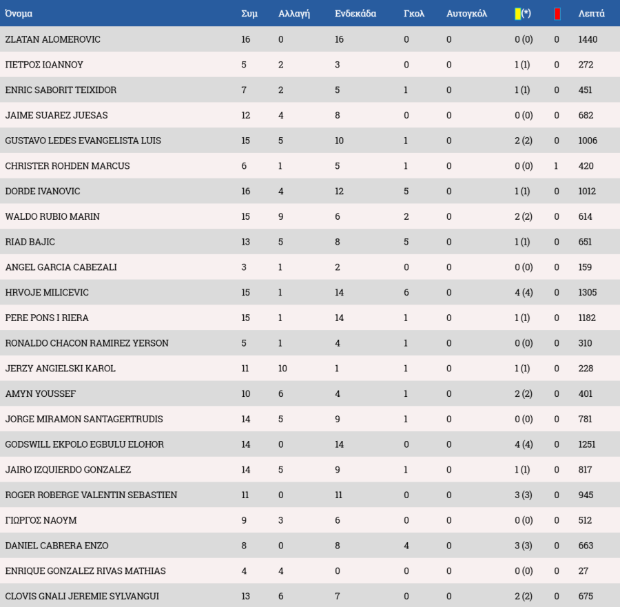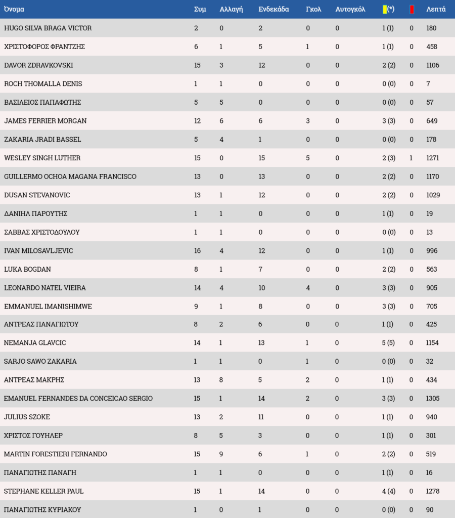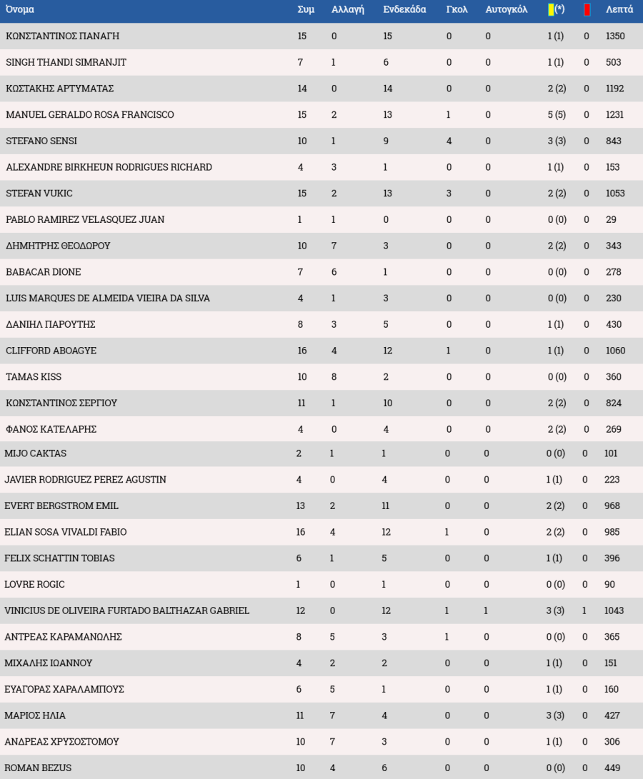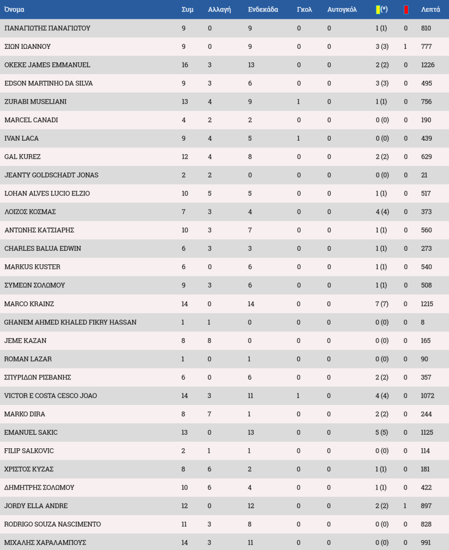 *Μαρκίνιος ως βασικός μετά την 1/11 με τον Εθνικό και ως αλλαγή στις 29/11 με την Ανόρθωση.