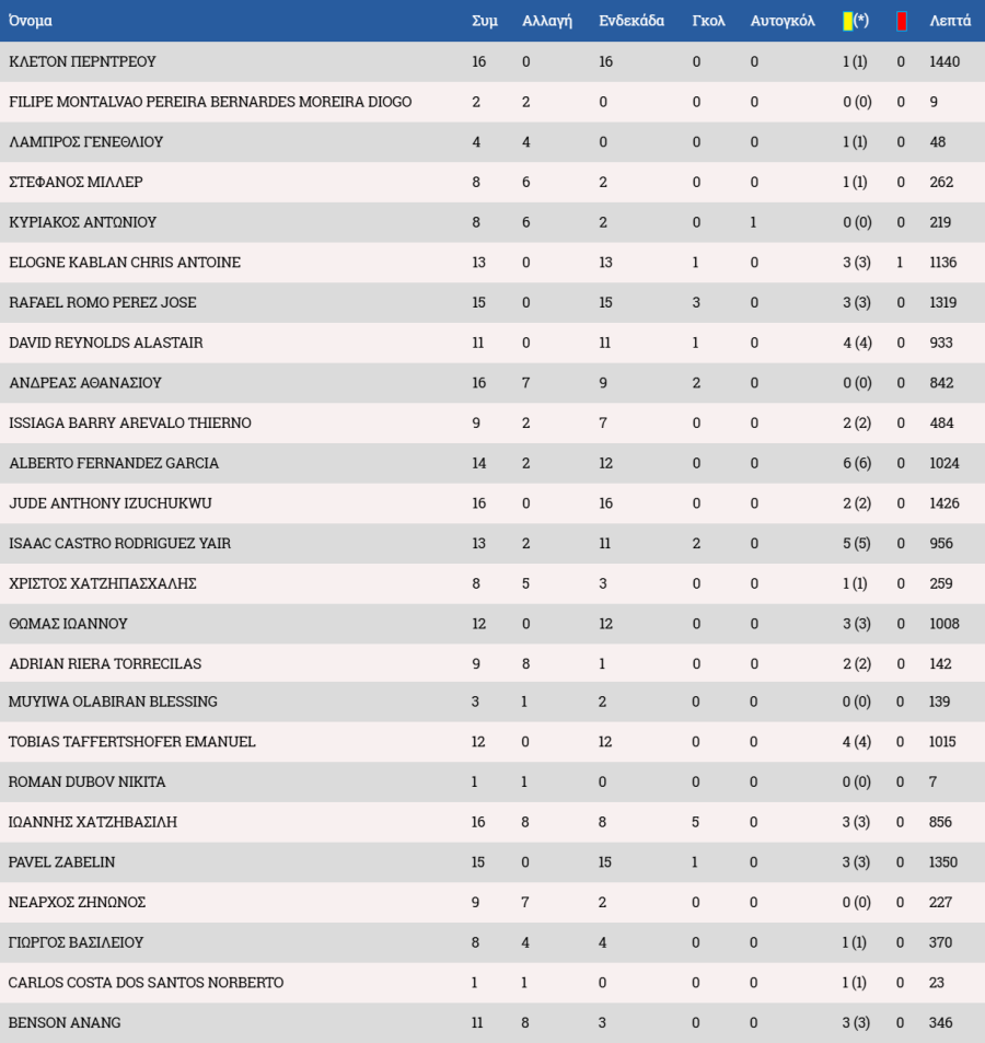 Πάφος: Μιχαήλ, Λουίζ, Μπρούνο, Κίνα(Ζάζα 66'), Όρσιτς, Λούκασεν, Σούνιτς, Ντράγκομιρ (Όντεφαλκ 82'), Άντερσον (Μπασουαμινά 66'), Κορέια, Πέπε.