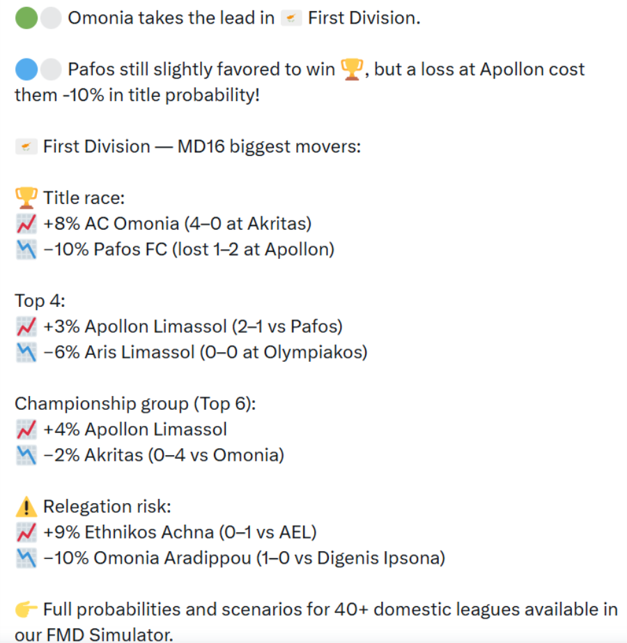 Η Ομόνοια αύξησε τα ποσοστά της κατά 7% για τον τίτλο μετά τη νίκη της επί του Ακρίτα (0-4), ενώ η Πάφος που παραμένει το φαβορί σημείωσε μείωση κατά με 8% μετά την ήττα στο ντέρμπι με τον Απόλλωνα (2-1).