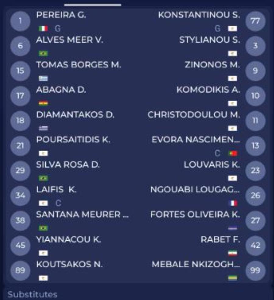 Στον πάγκο οι Τόνιτς, Νεάρχου, Μπουταρφά, Χατζητοφής, Ρόμπινσον, Σεργίου, Αντρέου, Ψύχας, Θεοχάρους, Κυριάκου.