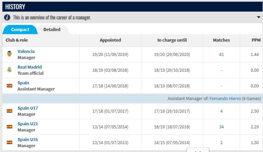 Ο 50χρονος Ισπανός προπονητής εργάστηκε τελευταία φορά στη Βαλένθια τη σεζόν 2019/20, όπου κάθισε στον πάγκο της ομάδας σε συνολικά 41 αναμετρήσεις. Στο παρελθόν έχει σημαντική εμπειρία από τις μικρές εθνικές ομάδες της Ισπανίας, ενώ διετέλεσε και μέλος του τεχνικού επιτελείου της ανδρικής εθνικής ομάδας.