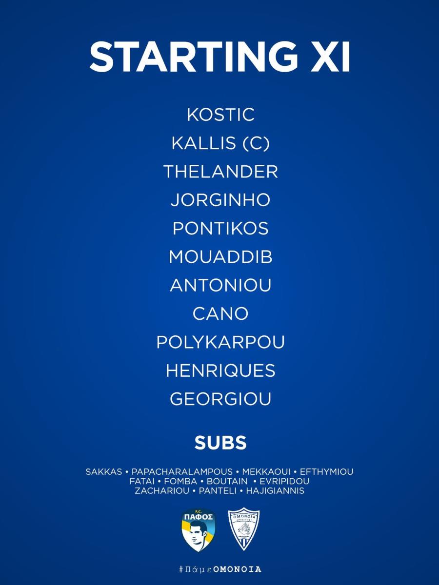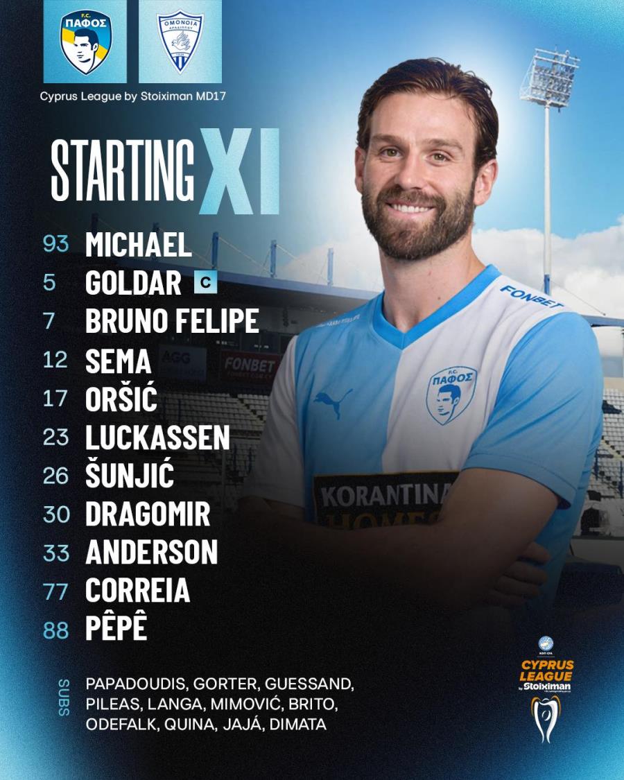 Πάφος FC (Θελάδες): Μιχαήλ, Μπρούνο, Γκολντάρ, Λουκάσεν, Σέμα, Σούνιτς, Ντράγκομιρ, Πέπε, Άντερσον, Όρσιτς, Κορέια.