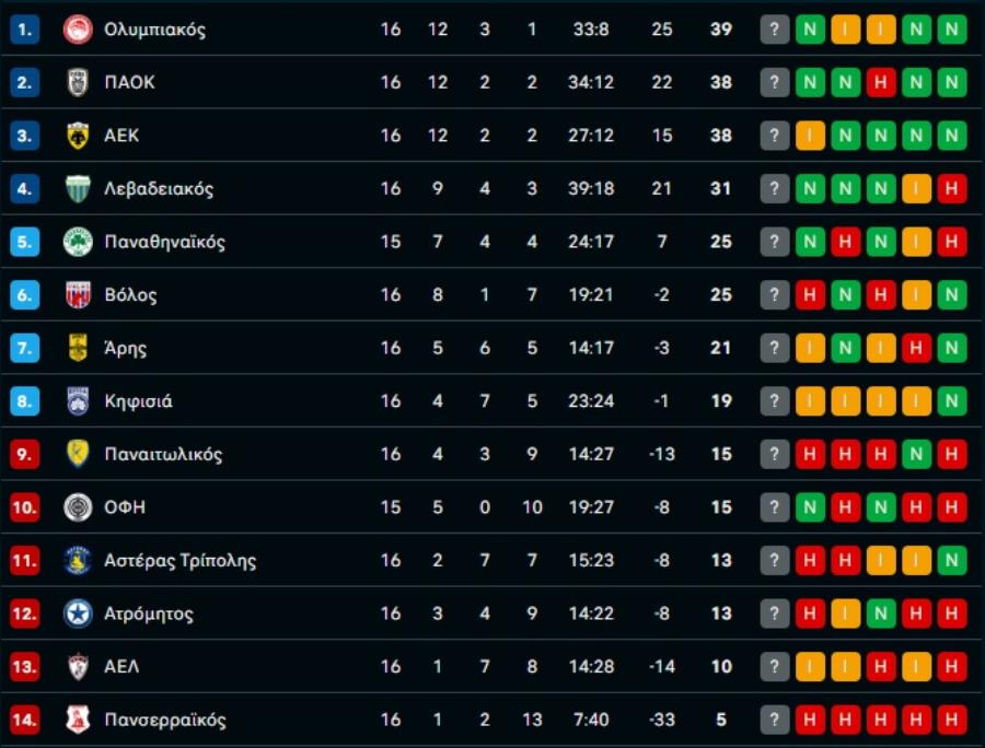 Ο Άρης κράτησε την ΑΕΚ στην 3η θέση κι έτσι ο Ολυμπιακός κατοικεί στο «ρετιρέ» της βαθμολογίας μετά τη 16η αγωνιστική. Πλησίασε στην τετράδα ο Παναθηναϊκός, ανεβαίνοντας 5ος, πάνω από τον Βόλο.