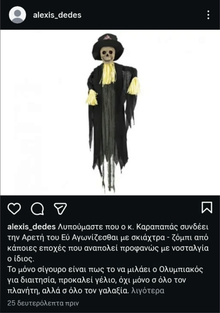 «Λυπούμαστε που ο κ. Καραπαπάς συνδέει την Αρετή του Εύ Αγωνίζεσθαι με σκιάχτρα-ζόμπι από κάποιες εποχές που αναπολεί προφανώς με νοσταλγία ο ίδιος.