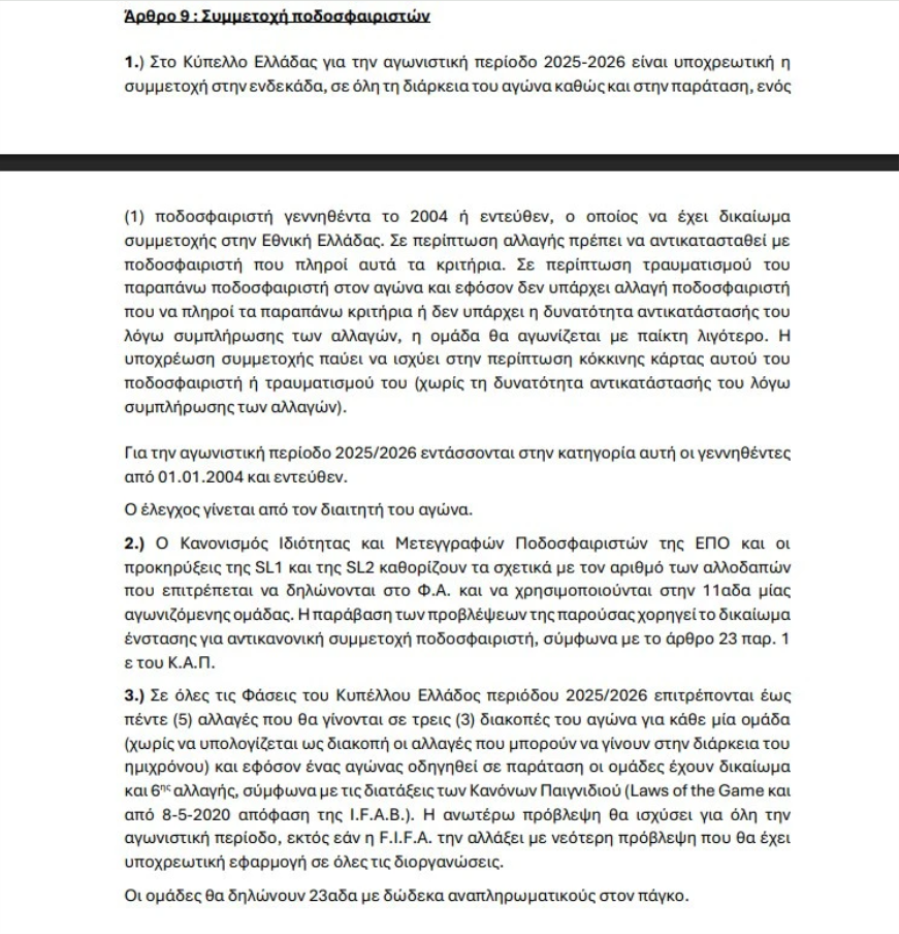 Οι κυρώσεις που ισχύουν αν μια ομάδα δεν βάλει νεαρό ποδοσφαιριστή στην ενδεκάδα σε αγώνα Κυπέλλου όπως προβλέπει το νέο format.