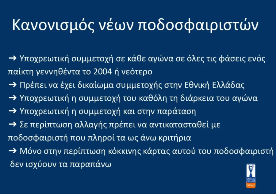 Υποχρεωτική συμμετοχή σε κάθε αγώνα σε όλες τις φάσεις ενός παίκτη γεννηθέντα το 2004 ή νεότερο
