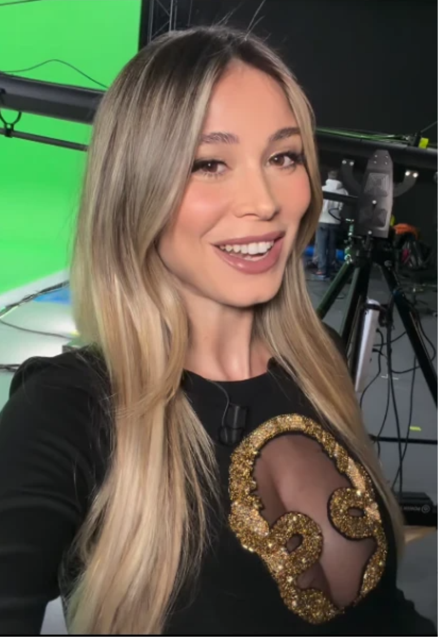Η διάσημη Ιταλίδα παρουσιάστρια φορούσε μια μαύρη μπλούζα με μακριά μανίκια και χρυσό μπροστά. Είχε, επίσης, διαφάνεια που άφηνε να φανεί το στήθος της.