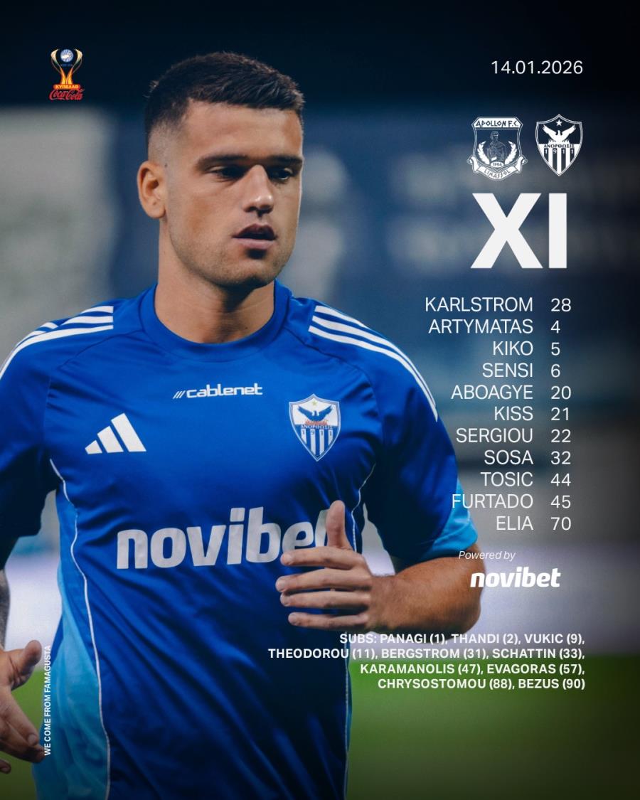 Απόλλωνας: Κουν, Βούρος, Μπράουν, Γκάρι, Μαλεκκίδης, Μπράντον Τόμας, Σιήκκης, Βεϊσμπέκ, Πέδρο Μάρκες, Κβίντα, Λιούμπιτς.