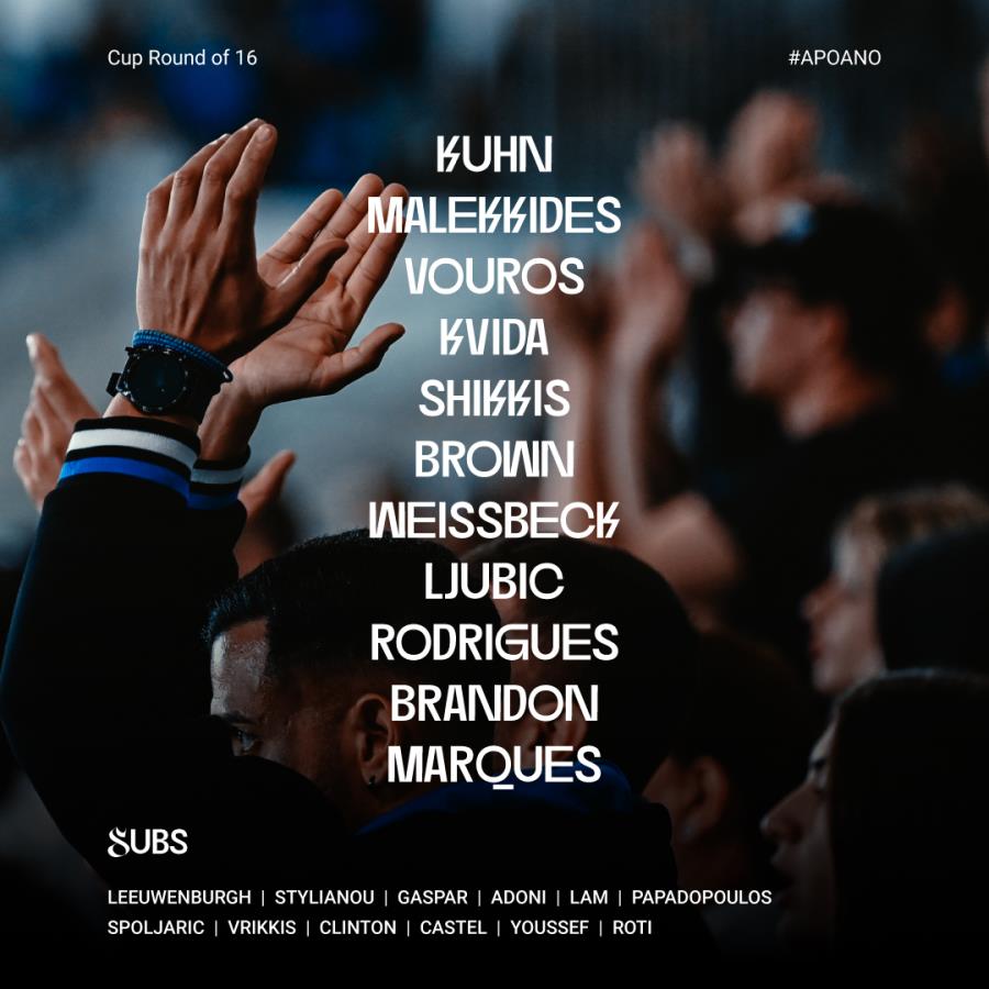 Στον πάγκο: Στυλιανού, Λέουβενμπεργκ, Λαμ, Άδωνη, Καστέλ, Ντουοντού, Σπόλιαριτς, Βρίκκης, Γκασπάρ, Γιουσέφ, Παπαδόπουλος και Ρωτής.