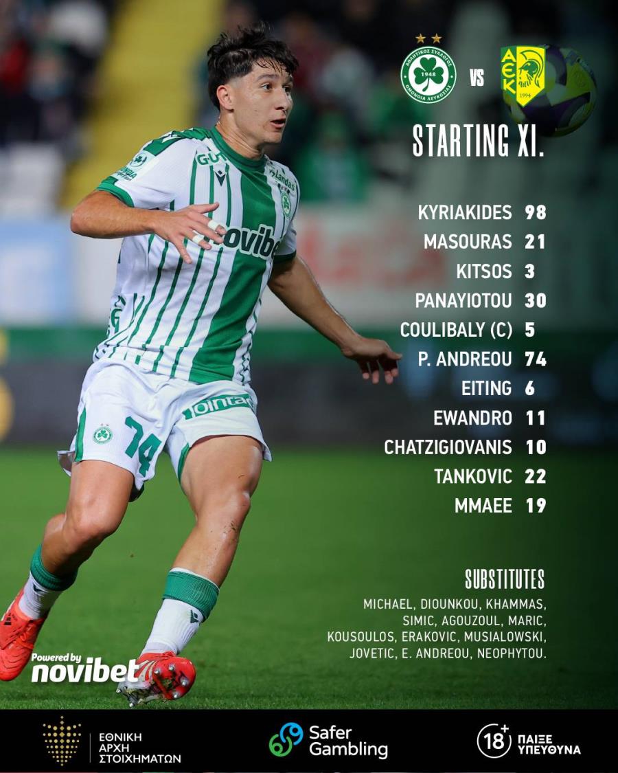 Στον πάγκο οι Μιχαήλ, Ντιουνκού, Γιόβετιτς, Μάριτς, Αγκουζούλ, Α. Ανδρέου, Χαμάς, Σίμιτς, Κούσουλος, Μουσιαλόφσκι, Εράκοβιτς, Νεοφύτου.