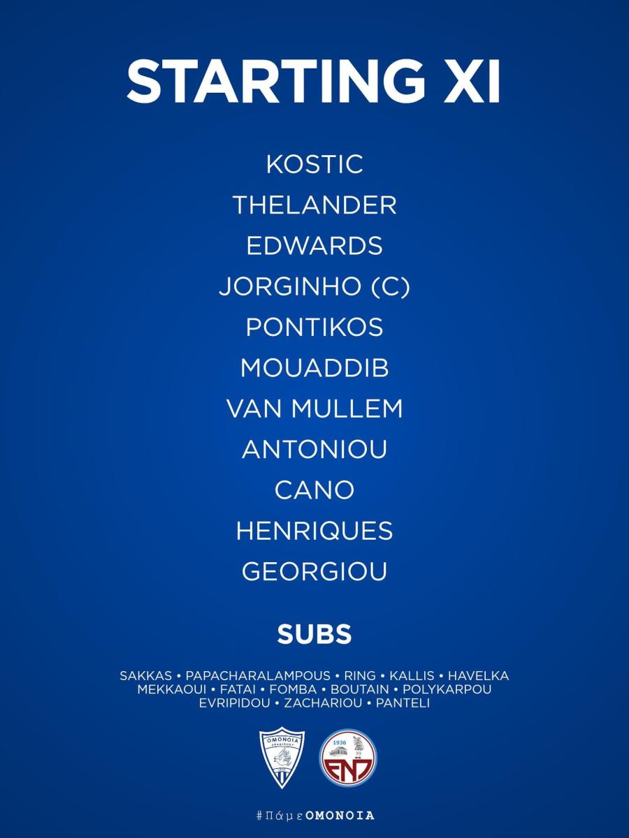 Ομόνοια Αραδίππου: Κόστιτς, Τελάντερ, Έντουαρντς, Ζορζίνιο, Ποντικός, Μουαντίπ, Βαν Μούλεμ, Αντωνίου, Κάνο, Ενρίκες, Γεωργίου