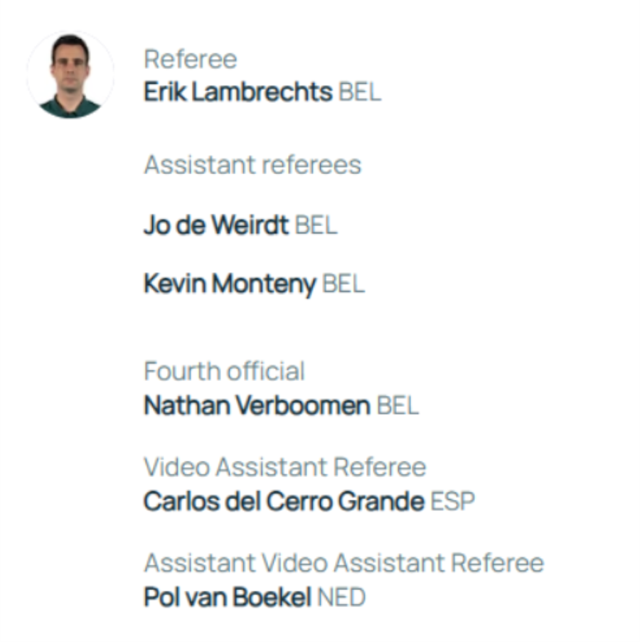 Ο Βέλγος, Erik Lambrechts θα είναι ο άρχοντας της αναμέτρησης ενώ στο VAR θα είναι ο Ισπανός, Carlos del Cerro Grande.