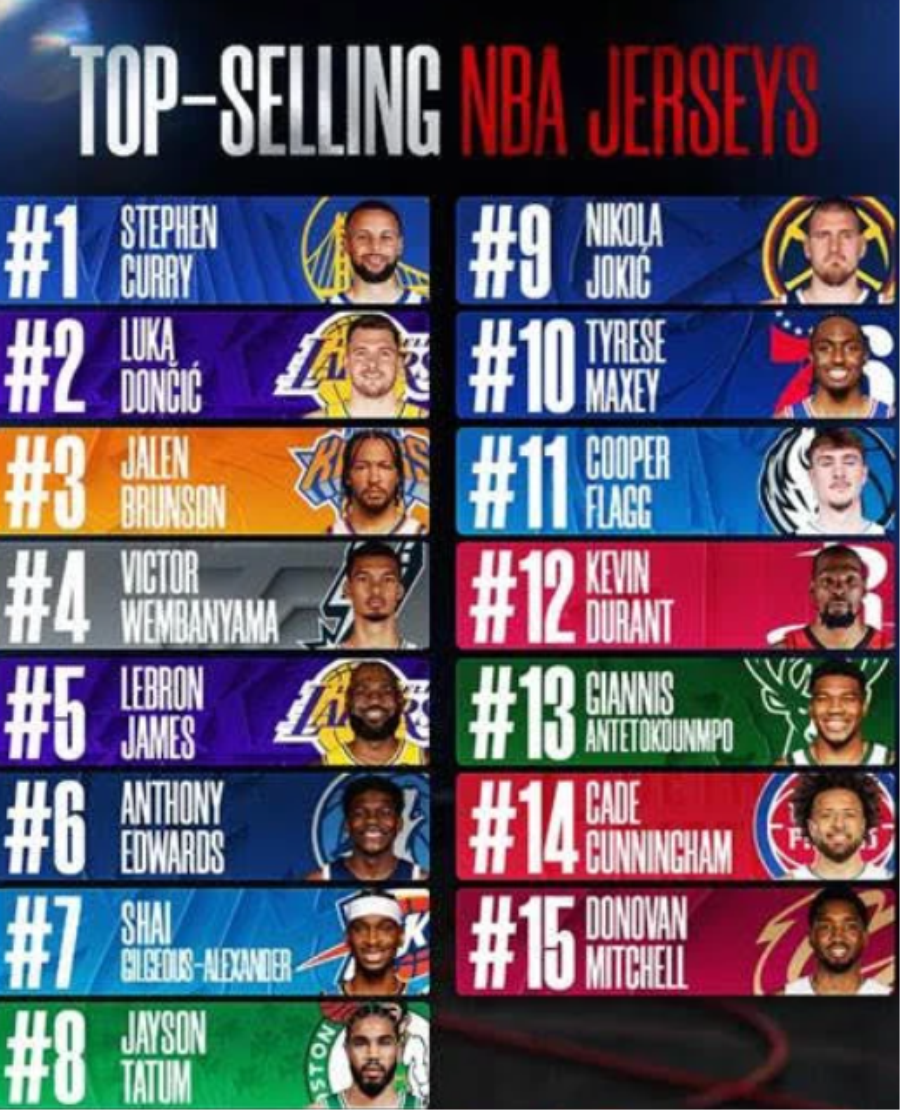 Αξίζει να αναφέρουμε πως ξεχωριστή θέση στην πιο εμπορική 15άδα έχουν οι Νίκολα Γιόκιτς (9ος), αλλά και ο Κούπερ Φλαγκ, με τον ρούκι των Ντάλας Μάβερικς να βρίσκεται ήδη στην 11η θέση στην πρώτη σεζόν του ως παίκτης της κορυφαίας λίγκας του πλανήτη.
