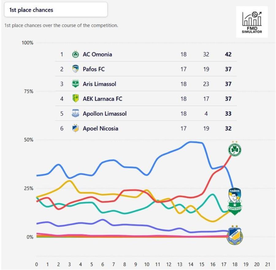 Σύμφωνα με τη σελίδα η Ομόνοια είναι το φαβορί για τον τίτλο, με τις πιθανότητες της να αγγίζουν 42%, σημειώνοντας άνοδο +10%, ενώ η Πάφος είναι στο 37% μετά την πτώση -15% λόγω της ήττας από τον Ολυμπιακό.