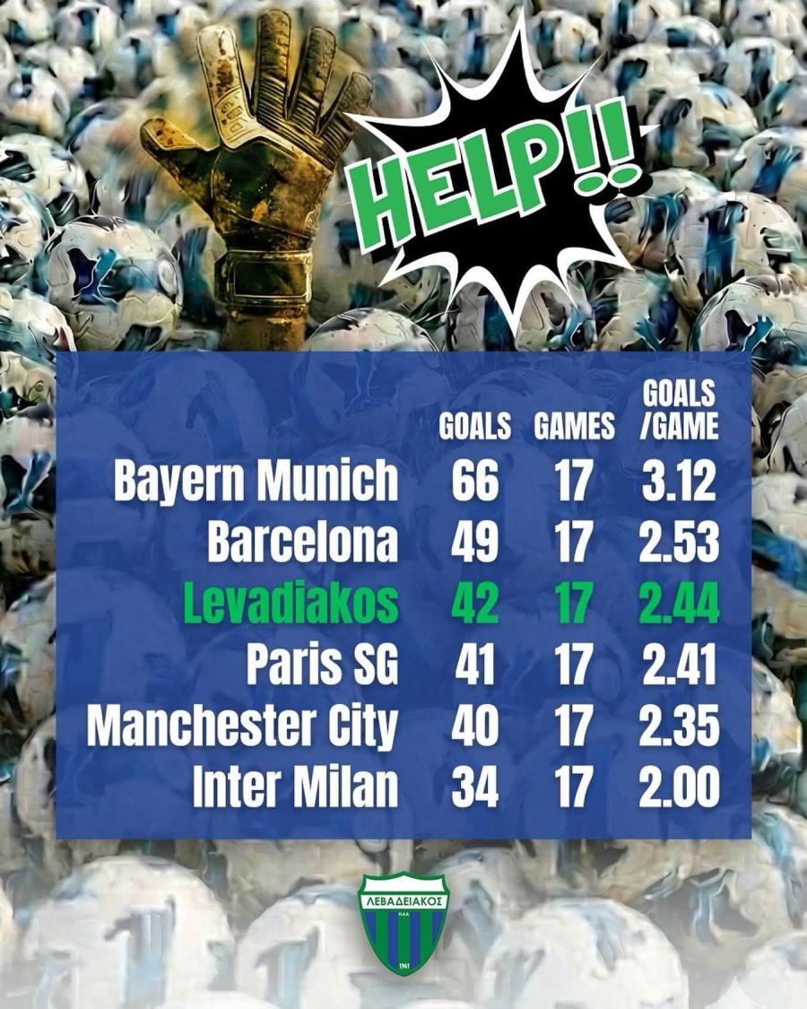 Με ανάρτησή της στα social media η ΠΑΕ παρουσίασε τον πίνακα με τις κορυφαίες επιθέσεις στην Ευρώπη και ο Λεβαδειακός φιγουράρει στην 3η θέση πίσω από τη Μπάγερν Μονάχου και τη Μπαρτσελόνα! Φόντο εμφανίζεται ένα γάντι τερματοφύλακα να ζητάει... βοήθεια.