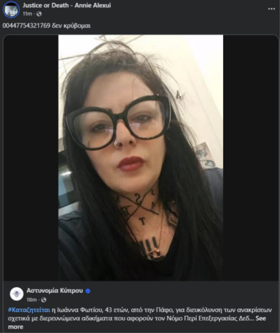 Αναδημοσιεύοντας την ανακοίνωση της Αστυνομίας με τη φωτογραφία της όπου αναφέρεται ότι καταζητείται για διάδοση ψευδών ειδήσεων δήλωσε «Δεν κρύβομαι».