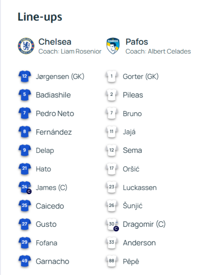 Τσέλσι (Ροζίνιορ): Γιόργκενσεν, Γκούστο, Φοφανά, Μπαντιασίλ, Χάτο, Τζέιμς, Καϊσέδο, Πέδρο-Νέτο, Φερνάντεζ, Γκαρνάτσο, Ντέλαπ.
