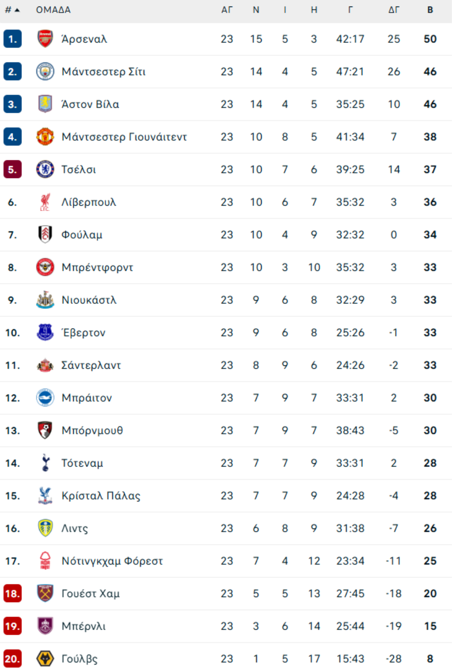 VIDEO Κυριακή 25/01 Μπρέντφορντ-Νότιγχαμ Φόρεστ 0-2 (Τζίζους 12', Αβονίγι 80') Κρίσταλ Πάλας-Τσέλσι 1-3 (Ρίτσαρντς 88'/Εστεβάο 34', Πέντρο 50', Φερνάντες 64' πεν.) Νιούκαστλ-Άστον Βίλα 0-2 (Μπουεντία 19', Γουάτκινς 88')Άρσεναλ-Μάντσεστερ Γιουνάιτεντ 2-3 (29' αυτ. Μαρτίνες, 84' Μερίνο-37' Εμπεμό, 51' Ντόργκου, 87' Κούνια)
