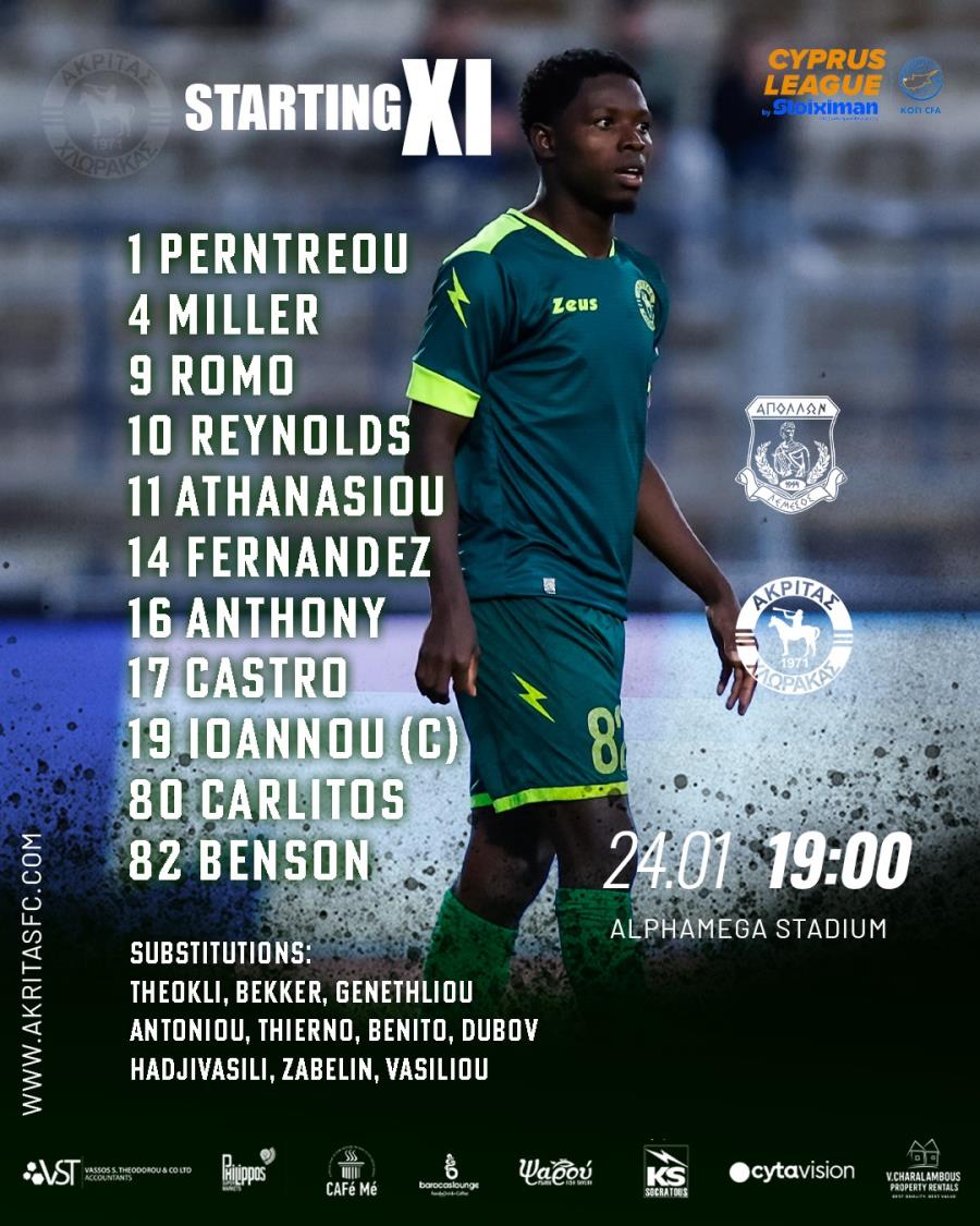 Ακρίτας: Περντρέου, Μίλλερ, Ρόμο, Ρέινολντς, Αθανασίου, Φερνάντεζ, Άντονι, Κάστρο, Ιωάννου, Καρλίτος, Ανάνγκ