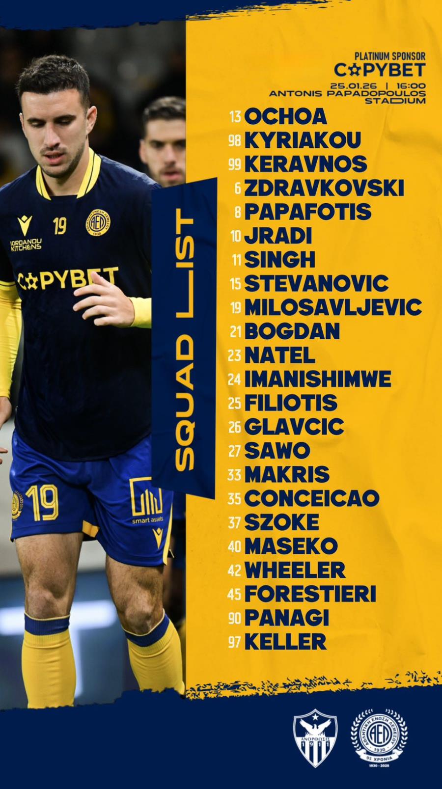 Μετά το τέλος της σημερινής (24/01) τελευταίας προπόνησης, ο Ούγκο Μαρτινς ανακοίνωσε την αποστολή, στην οποία συμπεριέλαβε 23 ποδοσφαιριστές.