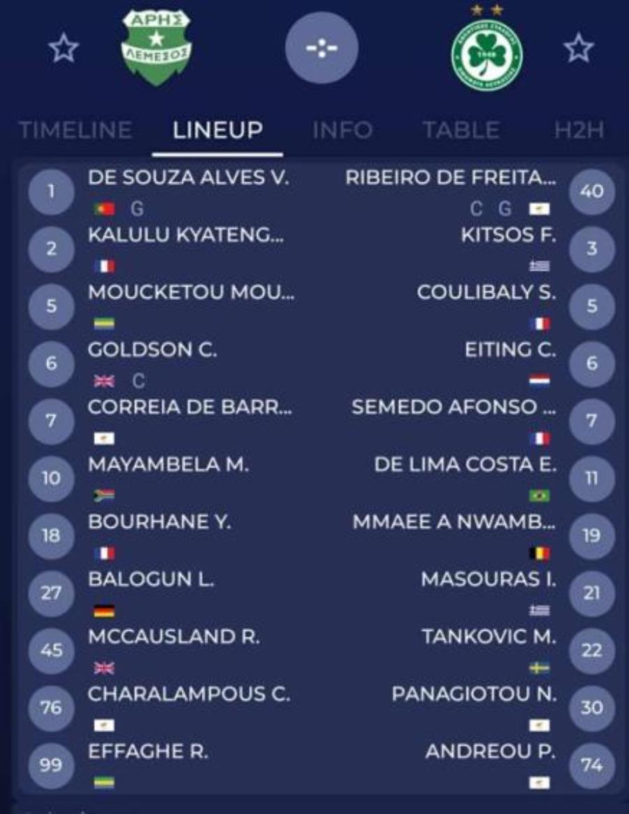 Στον πάγκο: Φοδέριγχαμ, Σωφρονίου, Λέλε, Κοκόριν, Γκομίς, Σανέ, Γιαγκό, Γκουστάβο, Μοντνόρ, Κακουλλής, Ακάμπα,
