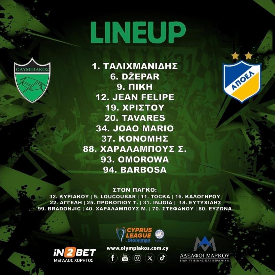 Στον πάγκο οι Περέιρα, Χριστοδούλου, Αντωνίου, Ντράζιτς, Ντάλσιο, Πουρσαϊτίδης, Μπρόρσον, Άπια, Γιαννακού.