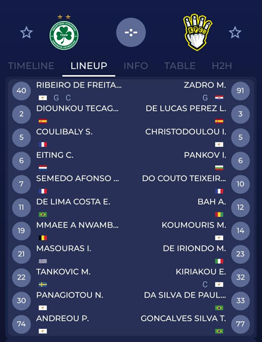 Στον πάγκο οι Ουζόχο, Κυριακίδης, Γιόβετιτς, Χατζηγιοβάνης, Μάριτς, Μαγιαμπέλα, Σίμιτς, Κούσουλος, Μουσιαλόφσκι, Εράκοβιτς, Νεοφύτου, Κωνσταντινίδης.