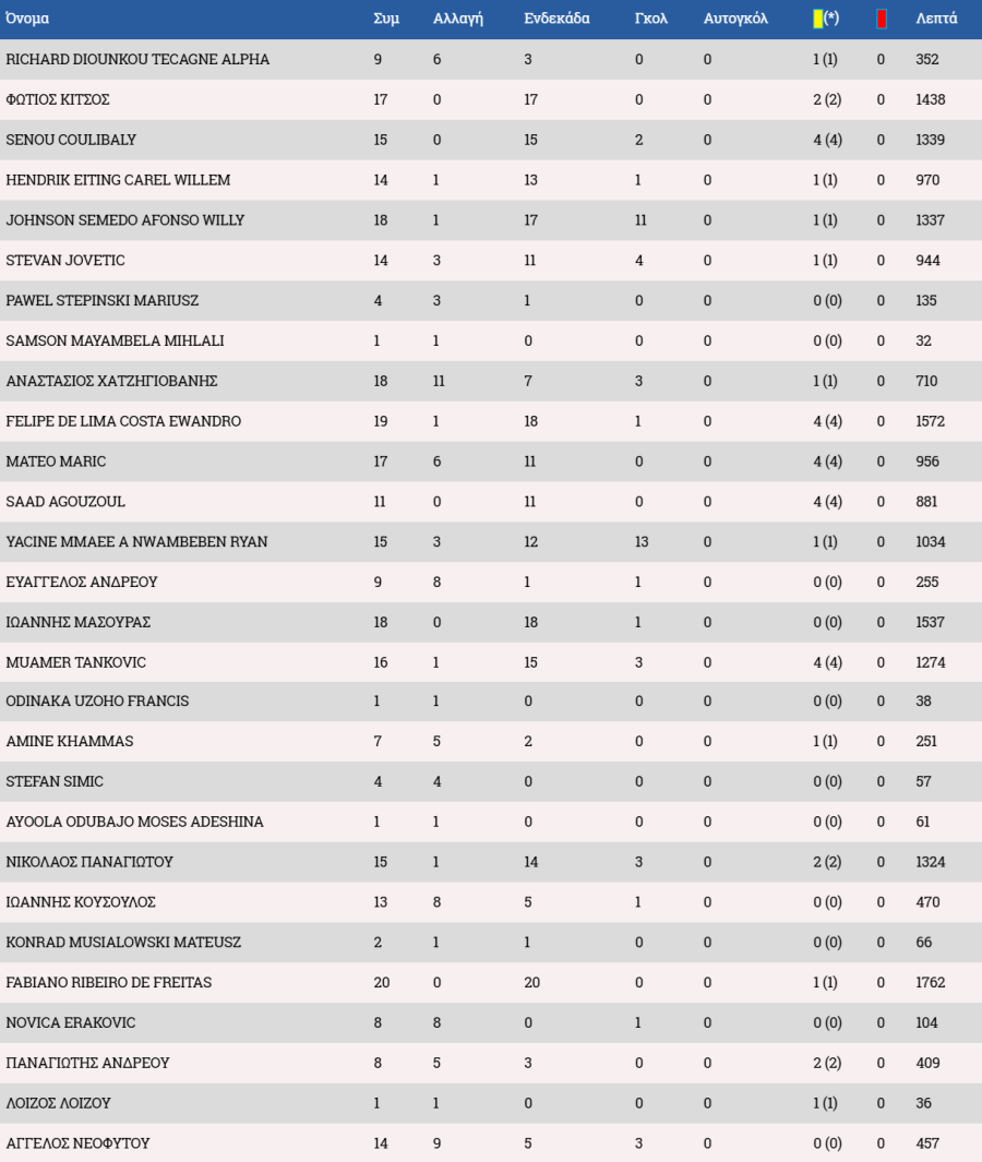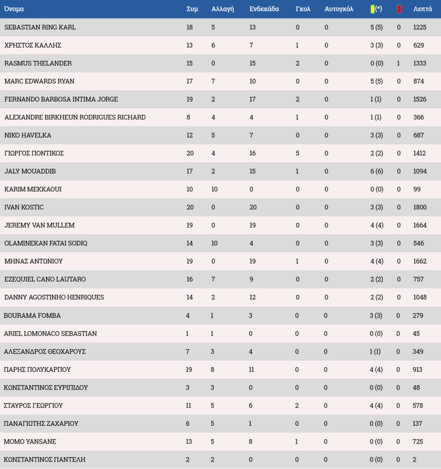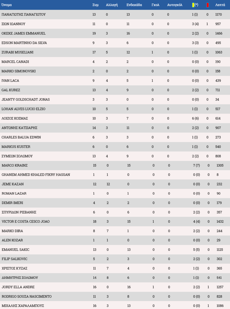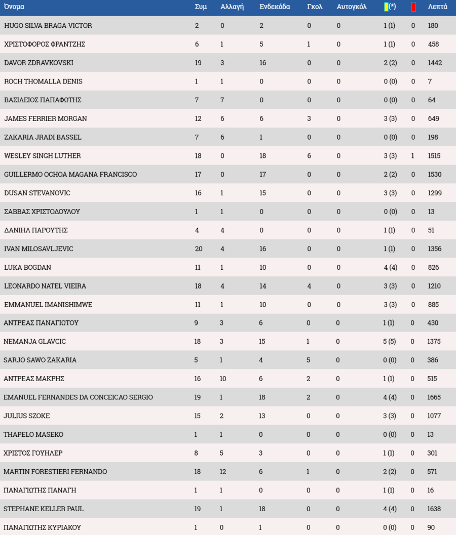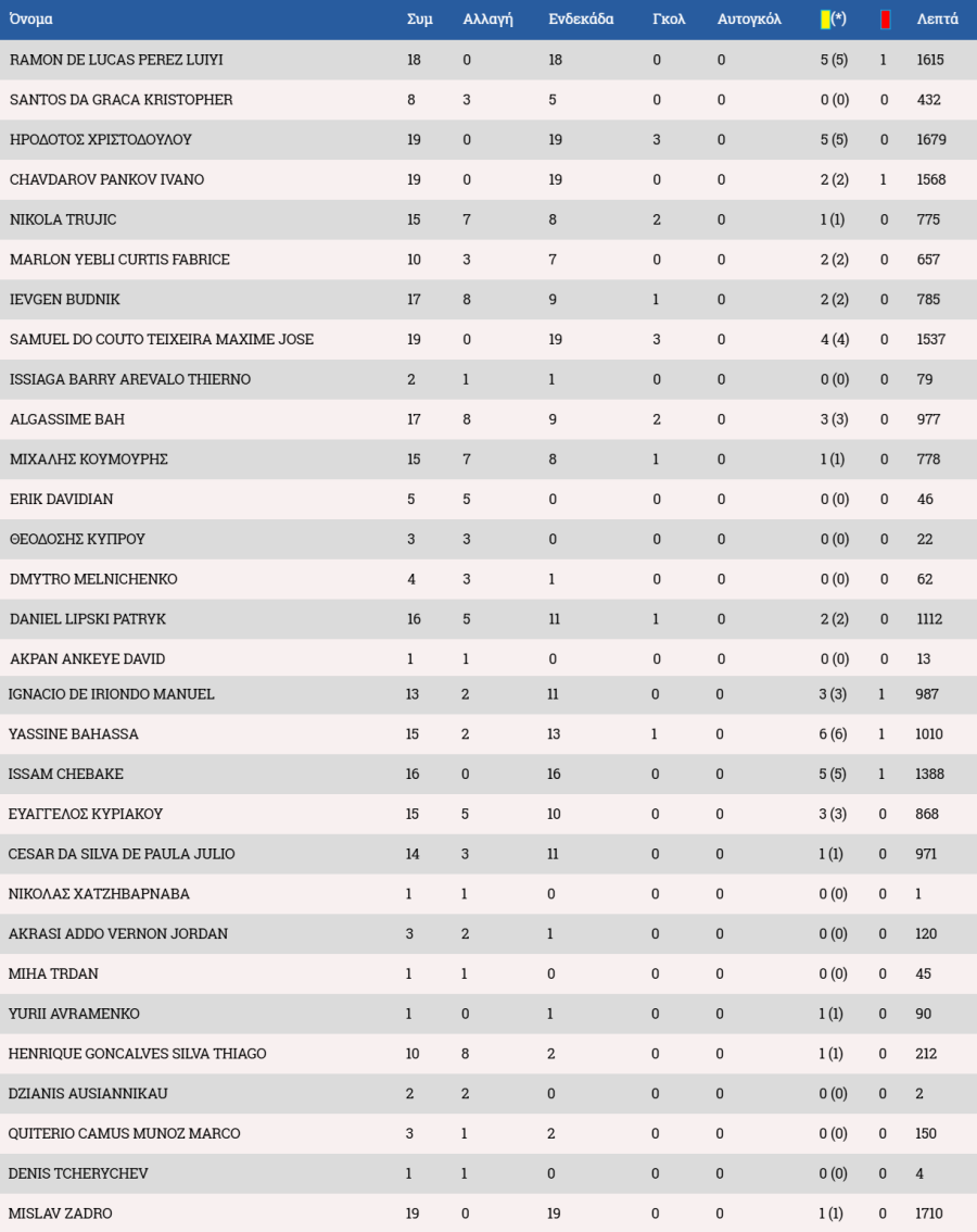 Κίτρινες: Ρινγκ 29', Κάνο 45', Γεωργίου 77', Κόστιτς 90'+/Μαλεκκίδης 45', Κβίντα 70', Λιούμπιτς 80', Σιήκκης 85'