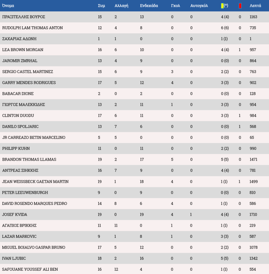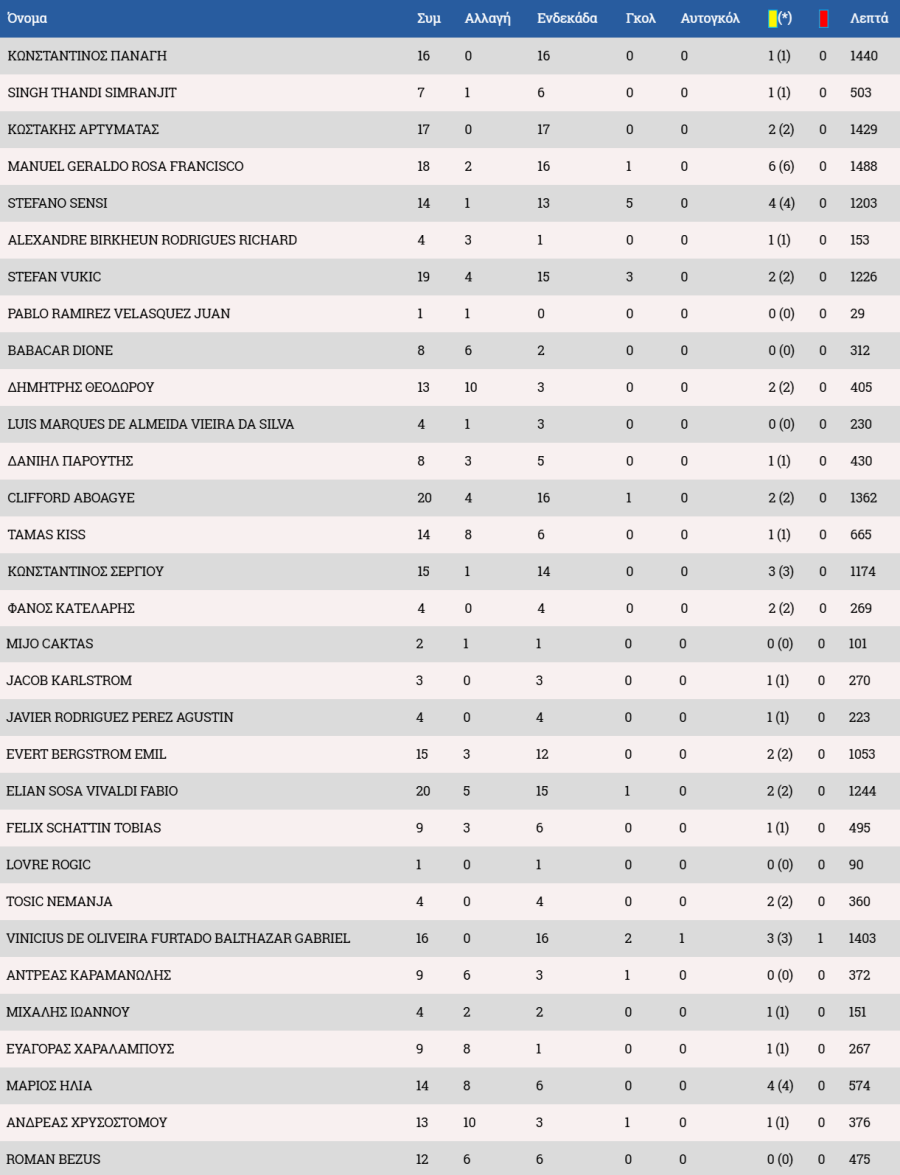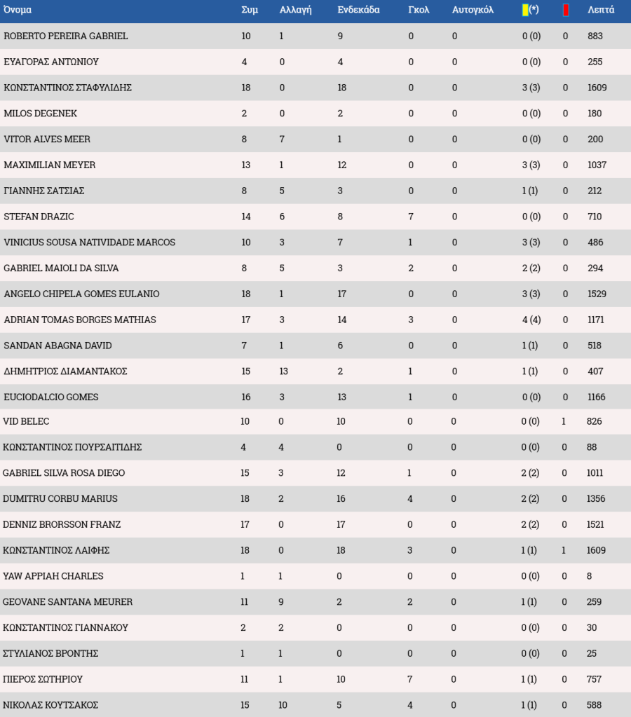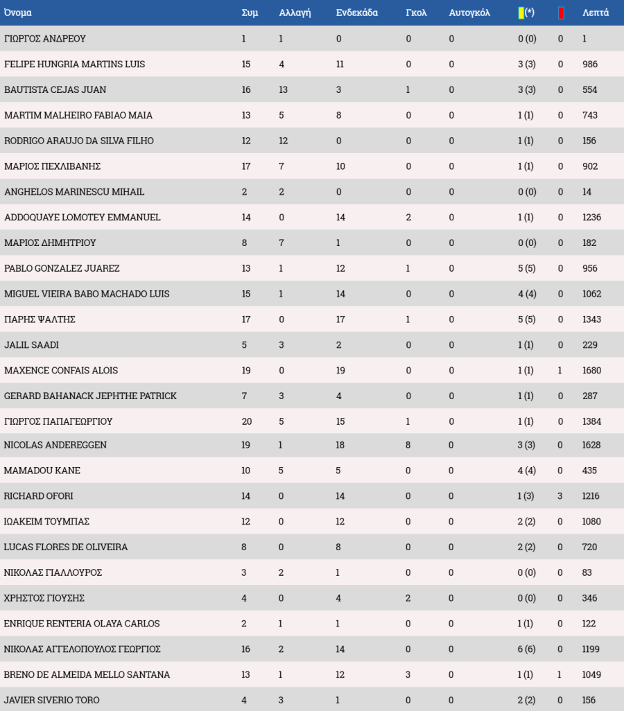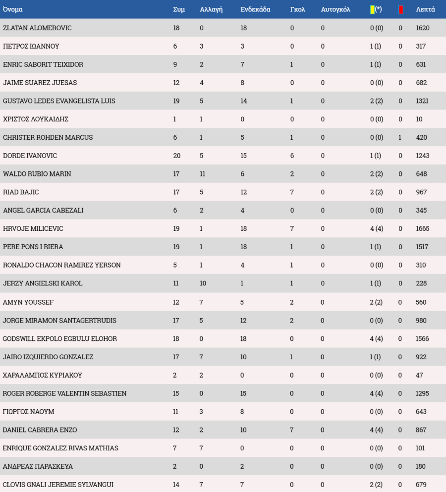 Κίτρινες: Ρινγκ 29', Κάνο 45', Γεωργίου 77', Κόστιτς 90'+/Μαλεκκίδης 45', Κβίντα 70', Λιούμπιτς 80', Σιήκκης 85'
