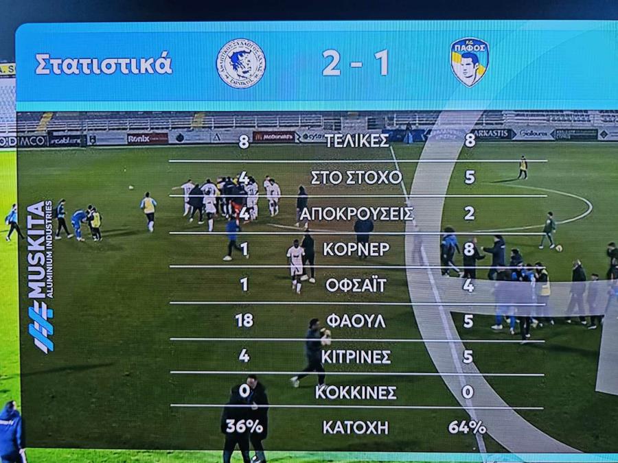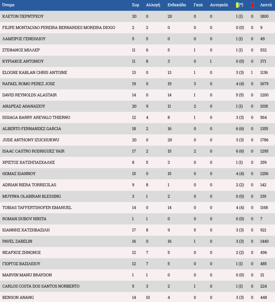 Πάφος: Γκορτέρ, Πηλέας (Όρσιτς 46'), Λουίζ, Μπρούνο, Κίνα, Ζάζα(Ντιμάτα 64'), Σέμα (Όντεφαλκ 75'), Λουκάσεν, Ντράγκομιρ, Άντερσον, Πέπε.