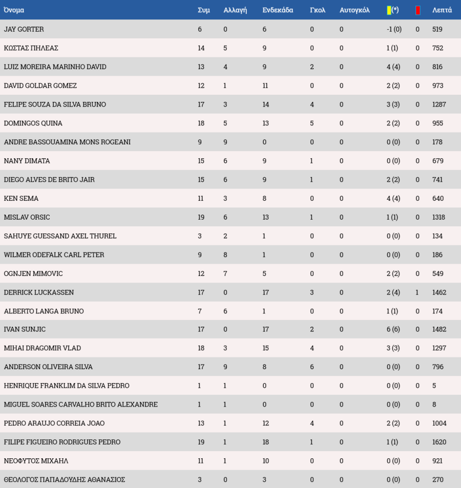 *2 αλλαγές σε σχέση με Ολυμπιακό: Σολωμού Σ., Σολωμού Δ. αντί Οκέκε Μουσελιάνι.
