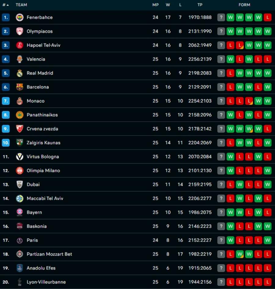 Όσον αφορά τον Ολυμπιακό, ο οποίος επιβλήθηκε της Μπαρτσελόνα στο ΣΕΦ το βράδυ της Πέμπτης για να ανέβει στο 16-8, παραμένει και εκείνος στα ψηλά της βαθμολογίας, όντας μόλις μία νίκη μακριά από την κορυφή.