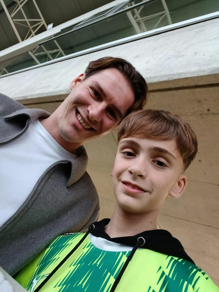 Τον 29χρονο Κροάτη μεσοεπιθετικό εντόπισαν οι φίλοι της ΑΕΚ, με τον Μουντραζίγια να φωτογραφίζεται με τον μικρό Νικόλα πριν την έναρξη του αγώνα.