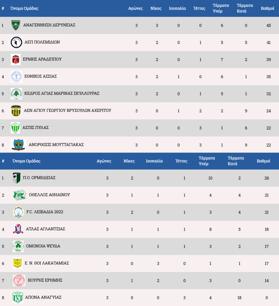 Στη γ' κατηγορία Αναγέννηση, ΑΕΠΠ και Ερμής είναι τα φαβορί για την άνοδο, με τον Εθνικό Άσσιας να είναι στο -4 από την τριάδα. Η μάχη για την παραμονή εξελίσσεται σε πραγματικό θρίλερ.