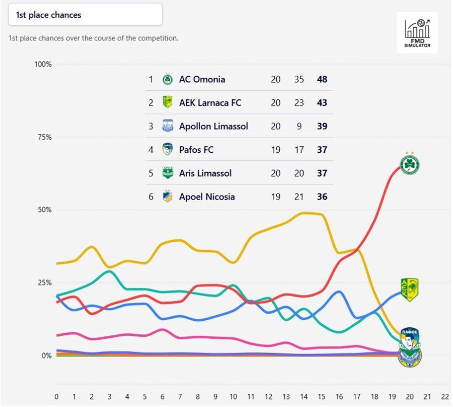 Μόλις τρεις αγωνιστικές πριν, η Πάφος παρουσιαζόταν ως το απόλυτο φαβορί για την κατάκτηση του πρωταθλήματος. Ωστόσο, οι τρεις διαδοχικές ήττες άλλαξαν δραματικά τα δεδομένα, ρίχνοντας τις πιθανότητές της στο μόλις 6%!