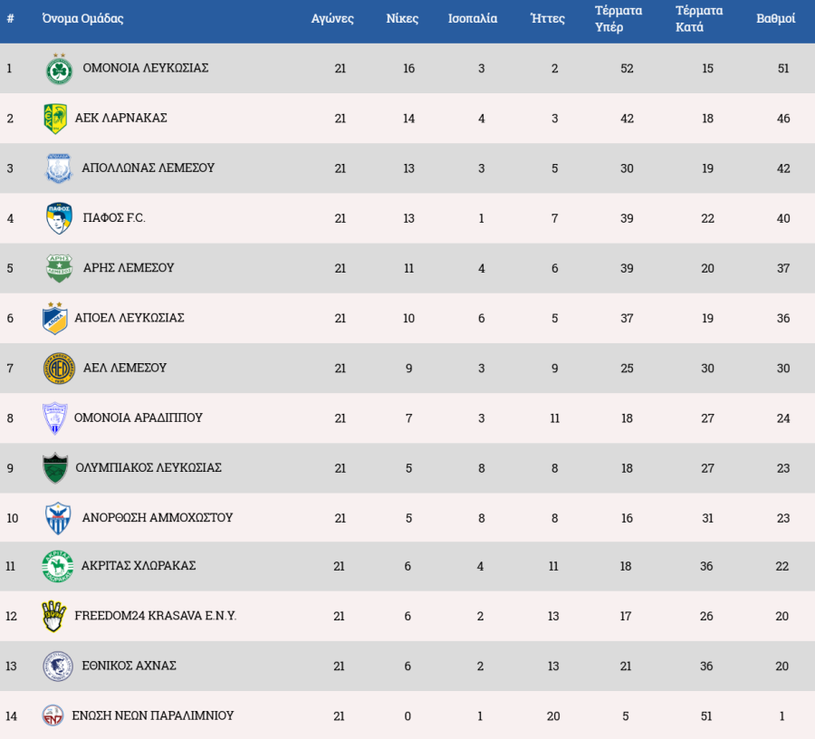 Πάφος –Ομόνοια 2-4 (Πηλέας 8', Λελέ 79'/Μαέ 11', Σεμέδο 50', 80', 90' πεν.)
