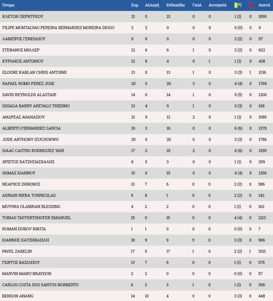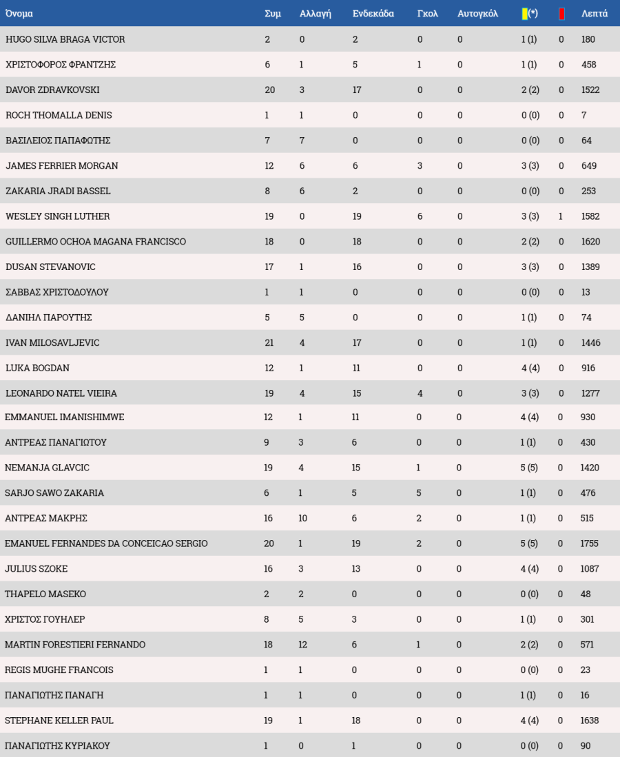 *6 αλλαγές σε σχέση με Απόλλωνα στο κύπελλο: Ρινγκ, Έντουαρντς, Ζορζίνιο, Ποντικός, Βαν Μιούλεμ, Γεωργίου αντί Καλλή, Χαβέλκα, Κάνο, Λομονάκο, Πολυκάρπου, Ζαχαρίου.
