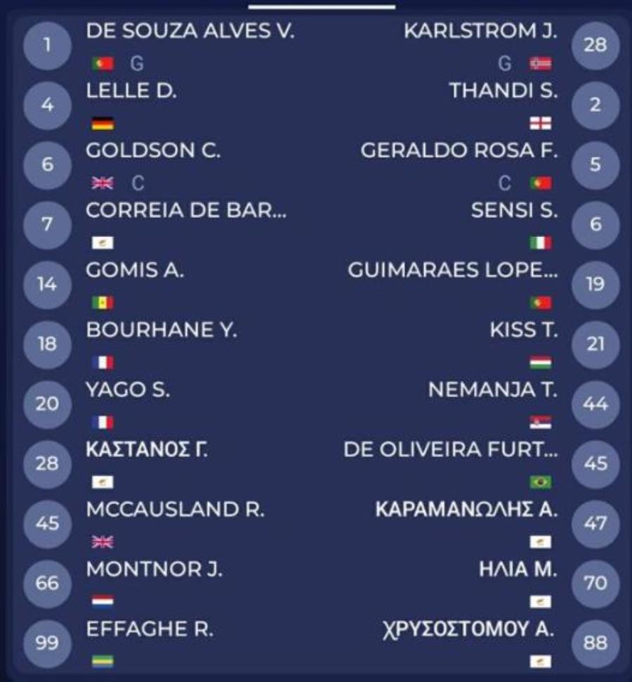 Στον πάγκο: Παναγή, Βούκιτς, Θεοδώρου, Αμποάγκι, Κατελάρης, Μπέργκστρομ, Σόσα, Σετίν, Μίντεντορπ, Ιωάννου, Χαραλάμπους, Αλέσιο.