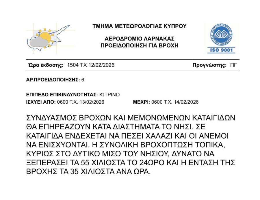 Η προειδοποίηση τίθεται σε ισχύ από τις 6 ή ώρα αύριο το πρωί μέχρι τις 6 το πρωί του Σαββάτου.