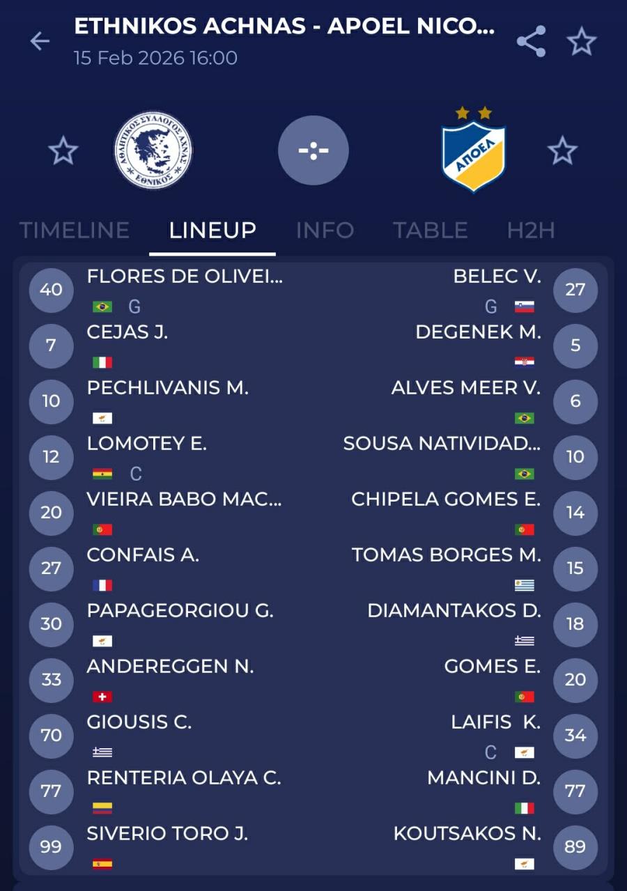 Στον πάγκο: Τούμπας, Κωνσταντίνου, Ανδρέου, Δημητρίου, Ψάλτης, Γιάλλουρος, Περδίος, Σοάρες.