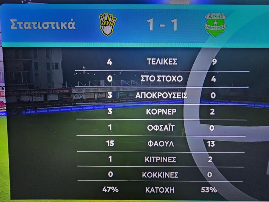 ΕΝΥ–Άρης 1-1 (Γκόλντσον 89'αυτ. /Κακουλλής 53')