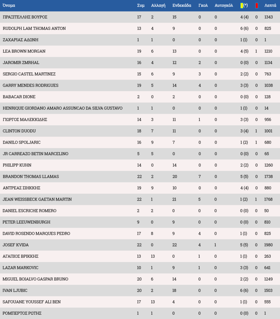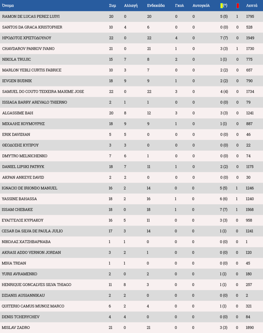 Στον πάγκο: Παναγιώτου, Λαζάρ, Γκόλντσχαντ, Ιωάννου Α., Σολωμού Σ., Αχμέντ, Σάλκοβιτς.