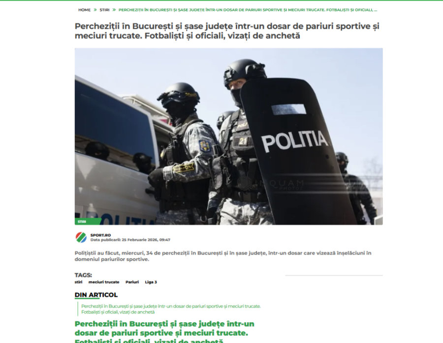 Όπως αναφέρει το ρουμανικό «sport.ro», πρόσωπα που συνδέονται με συγκεκριμένο ποδοσφαιρικό σύλλογο – ανάμεσά τους και ποδοσφαιριστές – φέρονται να επηρέαζαν αποτελέσματα αγώνων της Λίγκας 3, διοργάνωσης που τελεί υπό την αιγίδα της Ρουμανικής Ομοσπονδίας Ποδοσφαίρου.