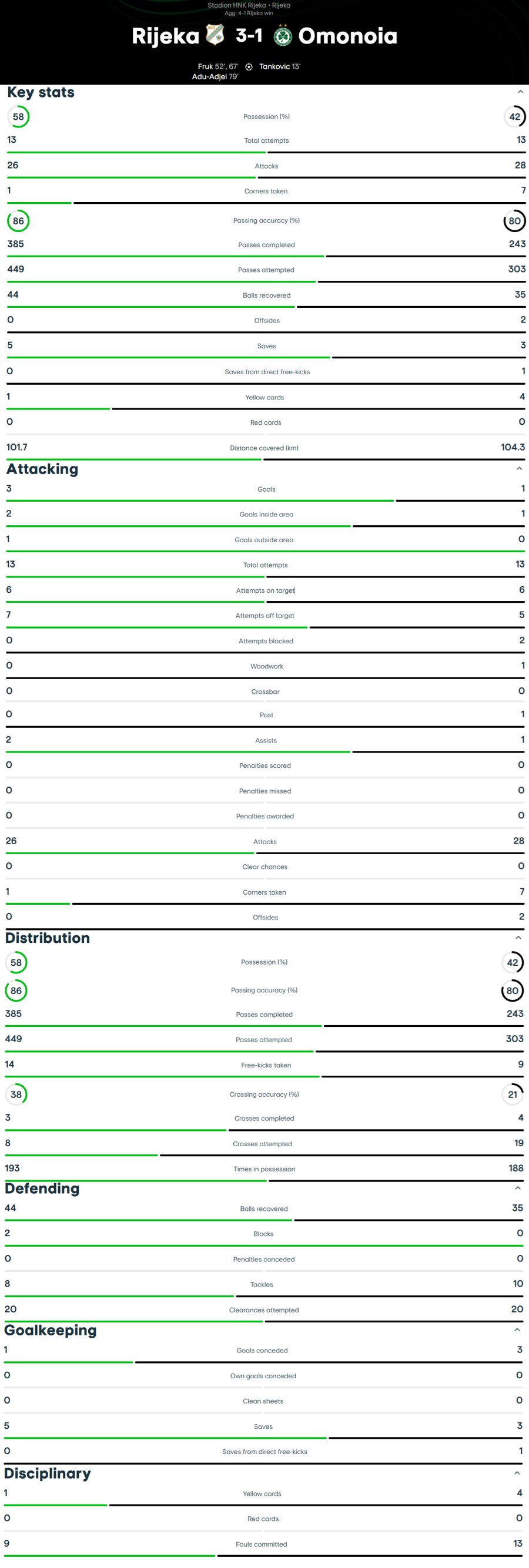 Στο β' μέρος οι πράσινοι επιδίωξαν να ξεκινήσουν επιβάλλοντας το δικό τους τέμπο, όμως με την πάροδο του χρόνου, ο αμυντικός μηχανισμός της Ομόνοιας δεν μπόρεσε να ανταποκριθεί, με την Ριέκα να κάνει την ανατροπή στο σκορ.