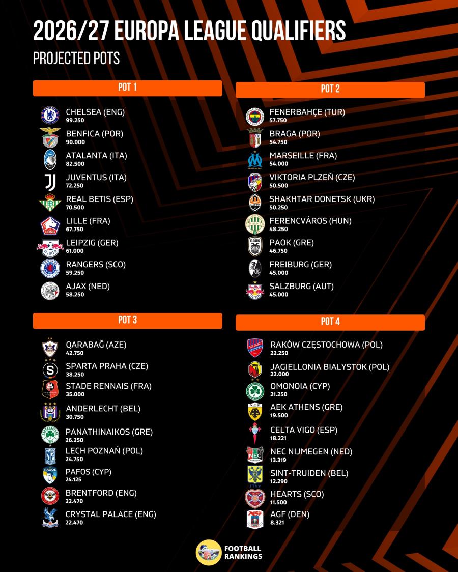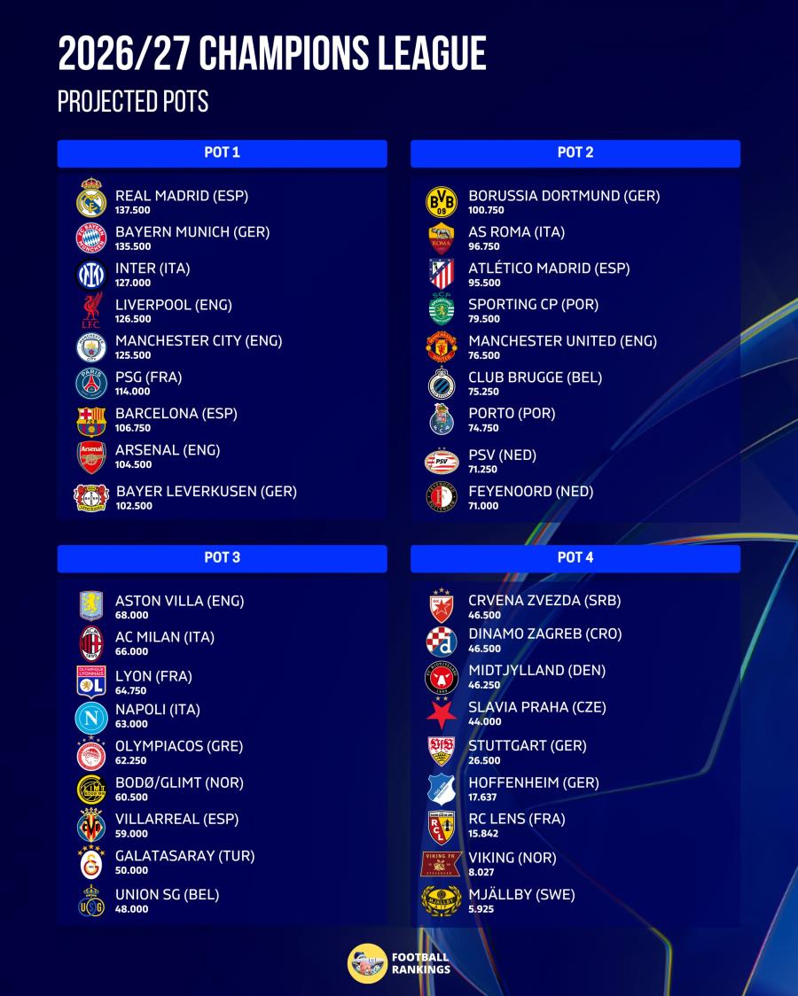 Ο συγκεκριμένος αλγόριθμος του Football Rankings δεν προβλέπει να έχουμε 4η ομάδα σε league phase.