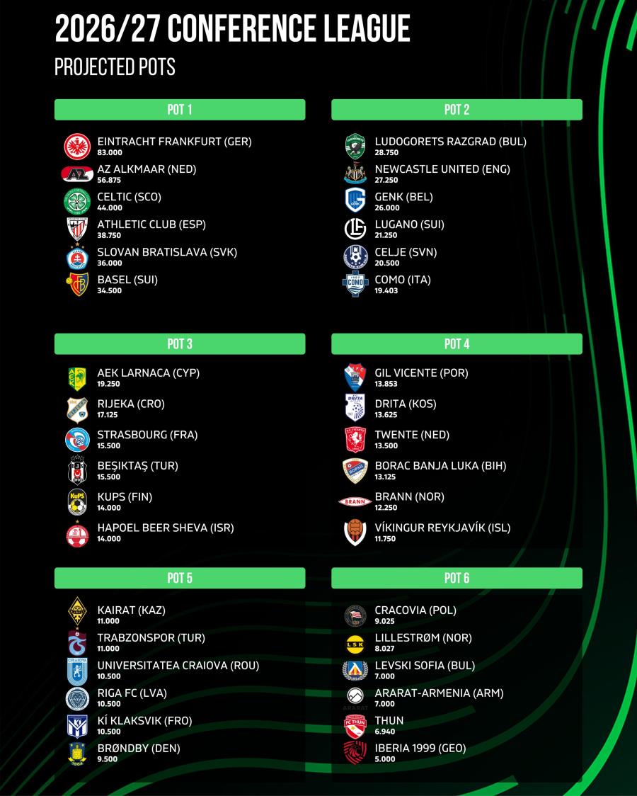 Για το Conference League, οι προβλέψεις τοποθετούν την ΑΕΚ Λάρνακας στο τρίτο γκρουπ δυναμικότητας στην κυρίως φάση του θεσμού.
