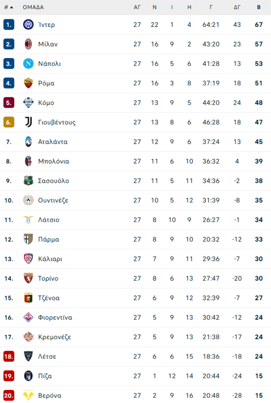 27η αγωνιστική: Παρασκευή 27/02Πάρμα-Κάλιαρι 1-1 (83' Οριστιάνο - 63' Φολορούσο)