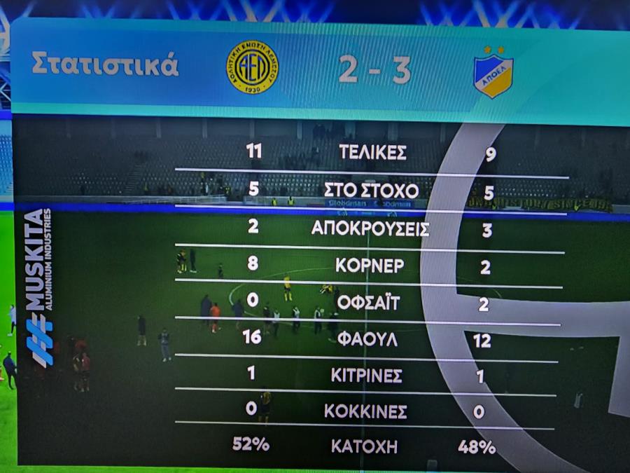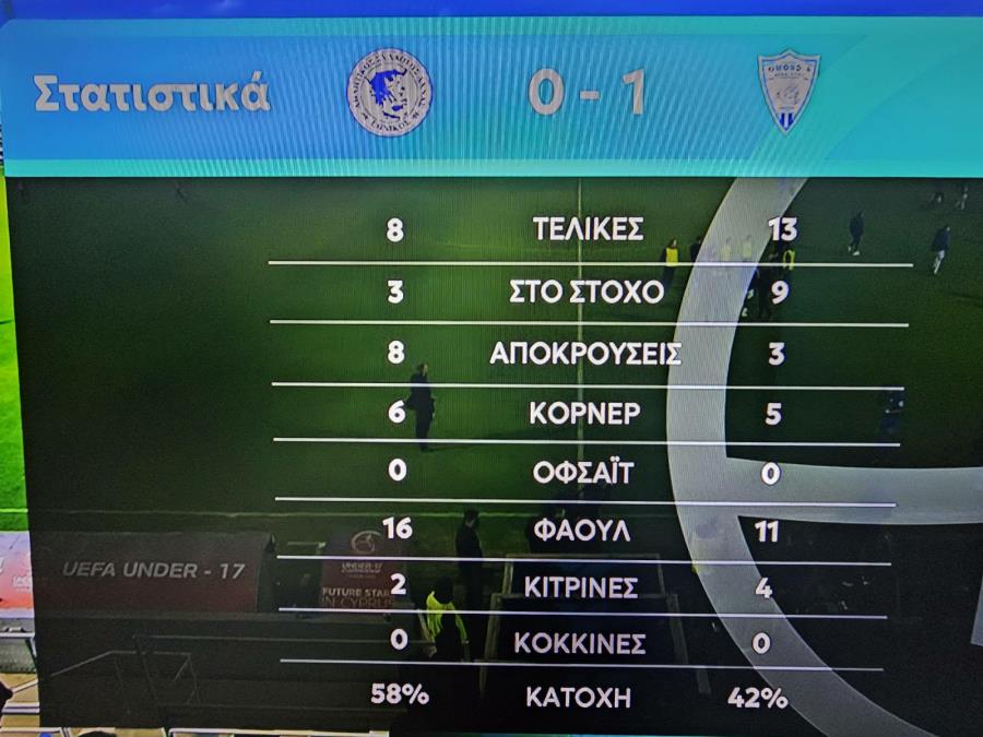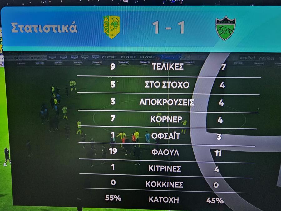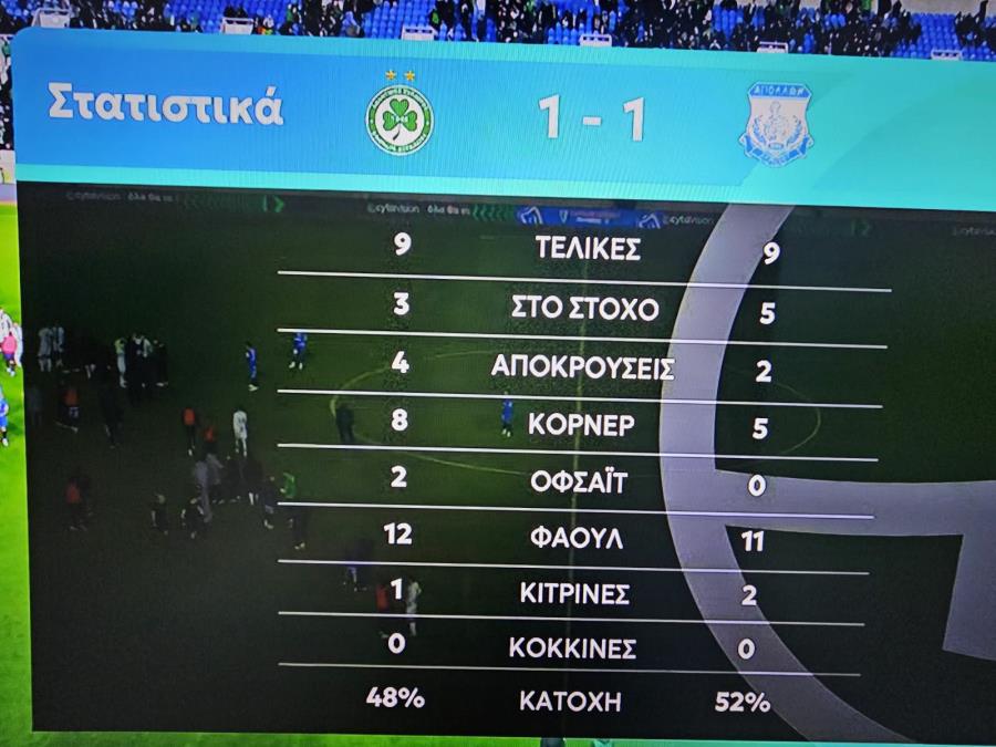 Ομόνοια-Απόλλωνας 1-1 (Τάνκoβιτς 40'/Ροντρίγκεζ 37') Ομόνοια: Ουζόχο, Κουλιμπαλί, Χατζηγιοβάνης (Χρίστου 84'), Εβάντρο, Μάριτς (Κούσουλος 89'), Μαέ, Μασούρας (Ντιουνκού 42'), Τάνκοβιτς (Γιόβετιτς 89'), Μπάλκοβετς, Παναγιώτου, Π.Ανδρέου. Στον πάγκο: Κυριακίδης, Μιχαήλ, Α.Ανδρέου, Σίμιτς, Οντουμπάτζο, Εράκοβιτς, Νεοφύτου, Κωνσταντινίδης. Απόλλωνας: Κουν, Βούρος, Μπράουν, Ζμέρχαλ, Ροντρίγκες(Εσκρίτσε 81'), Μπράντον (Μαλεκκίδης 90'), Σιήκκης (Γκασπάρ 78'), Βεϊσμπέκ(Βρίκκης 81'), Μάρκες, Κβίντα, Λιούμπιτς. Στον πάγκο: Λέουβενμπεργκ, Λαμ, Άδωνη, Ασουνσάο, Σπόλιαριτς, Μάρκοβιτς, Γιουσέφ, Ρωτής Κίτρινες: Μάριτς 25'/Τόμας 88', Μπράουν 90'Διαιτητής: Damian Robert Sylwestrzak Α' Βοηθός Διαιτητής: Εγγλέζου Νίκος Β' Βοηθός Διαιτητής: Γεωργίου Χαράλαμπος 4ος Διαιτητής: Χατζηγεωργίου Παναγιώτης VAR: Kornel Krzysztof Paszkiewicz AVAR: Κώστα Ροβέρτος *3 αλλαγές σε σχέση με Εθνικό: Βούρος, Σιήκκης και Λιούμπιτς αντί Γκασπάρ, Λαμ, Σπόλιαριτς. *3 αλλαγές σε σχέση με Ριέκα: Παναγιώτου, Χατζηγιοβάνης, Μάριτς αντί Σεμέδο, Άιτινγκ, Οντουμπάτζο. *12864 εισιτήρια *ΑΚΥΡΩΘΗΚΕ γκολ Ομόνοιας, μέσω VAR. *Κίτρινη σε μέλος του τιμ της Ομόνοιας (Λουγκρίδης) στο 38'. *Aποβλήθηκε μέλος του τιμ της Ομόνοιας (Gospodinov) στις καθυστερήσεις. https://www.youtube.com/watch?v=smD0WIJAI6I