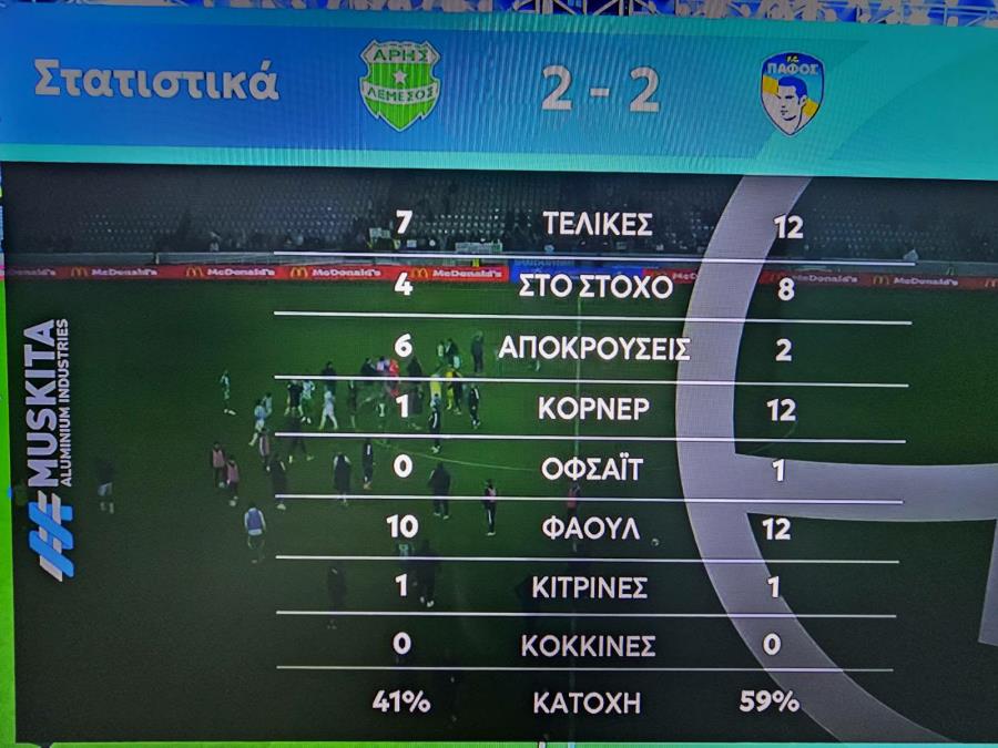 Άρης–Πάφος 2-2 (Μοντνόρ 76', Γκομίς 90'+/Άντερσον 79', 90'+8' πεν.) Άρης: Βανά, Γκόλντσον, Κορέια, Κακόριν(Εφαγκέ 73'), Μπουράν(Κάστανος 67'), Σανέ, Γιαγκό, Παζέ (Μοντνόρ 46'), Μακόσλαντ(Σεμέδο 67'), Χαραλάμπους, Κακουλλής(Γκομίς 82'). Στον πάγκο οι Φοδέριγχαμ, Σωφρονίου, Λελέ, , Γκάουσταντ, Θεοδοσίου, Ακάμπα. Πάφος: Μιχαήλ, Μπρούνο, Λουίζ,Ιωάννου , Όρσιτς (Σέμα 61'), Λελέ (Όντεφαλκ 89'), Μίμοβιτς, Ντράγκομιρ, Κορέια (Κίνα 61'), Σίλβα (Άντερσον 78'), Πέπε. Στον πάγκο οι: Πέτρου, Παπαδούδης, Πηλέας, Μπασουαμινά, Γκεσάν, Λουκάσεν. Κίτρινες: Σανέ 35', Χάμπος 00/Ιωάννου 84'Διαιτητής: Χριστοφόρου Μάριος Α' Βοηθός Διαιτητής: Καλογήρου Μάριος Β' Βοηθός Διαιτητής: Χριστοδούλου Πολύδωρος 4ος Διαιτητής: Λιοτατής Νικόλας VAR: Domingues Da Silva Narciso Andre Filipe AVAR: Τζιωρτζής Όμηρος Παρατηρητής: Σωτηρίου Μιχάλης *3 αλλαγές σε σχέση με Ανόρθωση: Μιχαήλ, Σίλβα, Κορέια αντί Γκόρτερ, Κίνα, Ζάζα. *4 αλλαγές σε σχέση με ΕΝΥ: Βανά, Γιαγκό, Μακόσλαντ, Παζέ αντί Φοδέρινχαμ, Λελέ, Μοντνόρ, Σεμέδο. https://www.youtube.com/watch?v=pN1SgdVv1o0